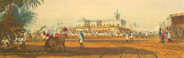 View of the Loll Bazaar and Portuguese Chapel Calcutta (Kolkata) by James Baillie Fraser , 1826. A obra certifica as presenças da cultura europeia e do zebu na Índia.